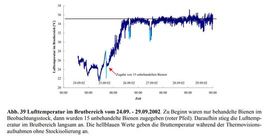 Interessanterweise haben es die Bienen nicht mehr geschafft, die erforderliche Temperatur von 34-35°C im Bienenstock zu regeln. Diese Temperatur ist aber essentiell wichtig, dass sich die Brut der Bienen optimal entwickelt. Eine zu niedrige Temperatur führt zu einer längeren Entwicklungsdauer der Bienen, zu einer höheren Sterberate in der Brut, zu einer starken Ausprägung der Brutkrankheit "Kalkbrut" und zu einer schlechteren physischen Entwicklung der Bienen (Denkleistung).